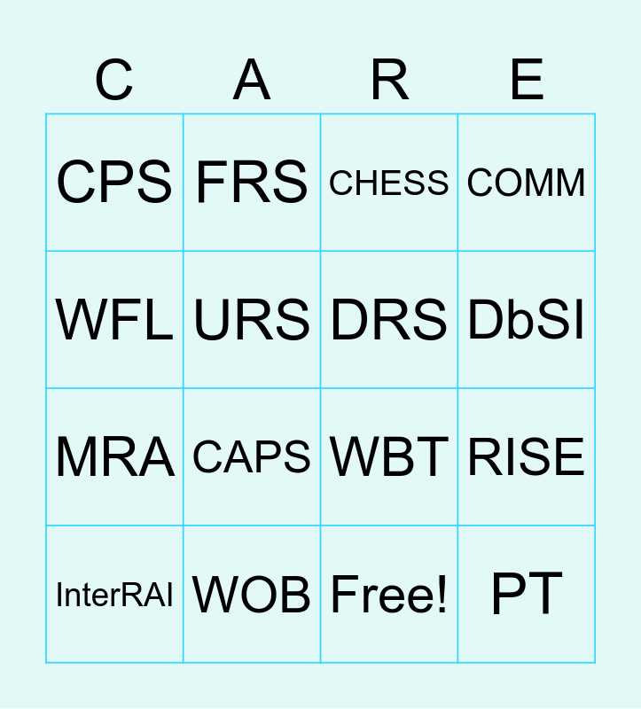This bingo card has 17 words: Free!, InterRAI, CHESS, CPS, CAPS, COMM, RISE, DRS, DbSI, URS, WOB, WBT, WFL, FRS, MRA, OT and PT.