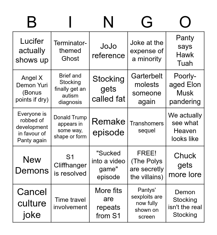 This bingo card has 25 words: S1 Cliffhanger is resolved, More fits are repeats from S1, Stocking gets called fat, Cancel culture joke, Panty says Hawk Tuah, Lucifer actually shows up, Angel X Demon Yuri (Bonus points if dry), Terminator-themed Ghost, Transhomers sequel, "Sucked into a video game" episode, Garterbelt molests someone again, Everyone is robbed of development in favour of Panty again, FREE! (The Polys are secretly the villains), Chuck gets more lore, Brief and Stocking finally get an autism diagnosis, Demon Stocking isn't the real Stocking, We actually see what Heaven looks like, JoJo reference, Poorly-aged Elon Musk pandering, Donald Trump appears in some way, shape or form, Remake episode, Time travel involvement, New Demons, Joke at the expense of a minority and Pantys' sexploits are now fully shown on screen.