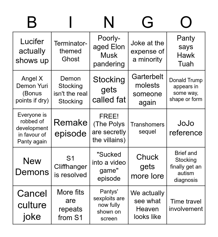 This bingo card has a free space and 24 words: S1 Cliffhanger is resolved, More fits are repeats from S1, Stocking gets called fat, Cancel culture joke, Panty says Hawk Tuah, Lucifer actually shows up, Angel X Demon Yuri (Bonus points if dry), Terminator-themed Ghost, Transhomers sequel, "Sucked into a video game" episode, Garterbelt molests someone again, Everyone is robbed of development in favour of Panty again, Chuck gets more lore, Brief and Stocking finally get an autism diagnosis, Demon Stocking isn't the real Stocking, We actually see what Heaven looks like, JoJo reference, Poorly-aged Elon Musk pandering, Donald Trump appears in some way, shape or form, Remake episode, Time travel involvement, New Demons, Joke at the expense of a minority and Pantys' sexploits are now fully shown on screen.