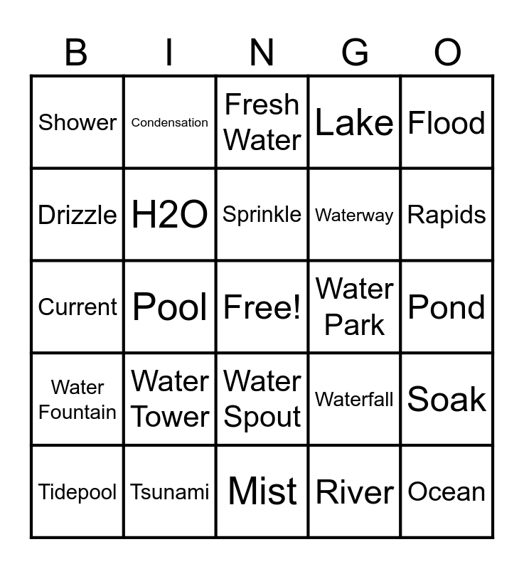 This bingo card has a free space and 39 words: Water, Ice, Rain, H2O, Tidepool, Water Spout, Sprinkle, Puddle, Flood, Water Fountain, Pool, Lake, Ocean, Pond, Water Park, Water Tower, Sea, Shower, Splash, Waterfall, Drizzle, Mist, Waterway, Rapids, Wet, Waves, Ground Water, Water Drop, Water Works, Condensation, Typhoon, Salt Water, Fresh Water, Tsunami, River, Aquatic, Soak, Current and Lagoon.