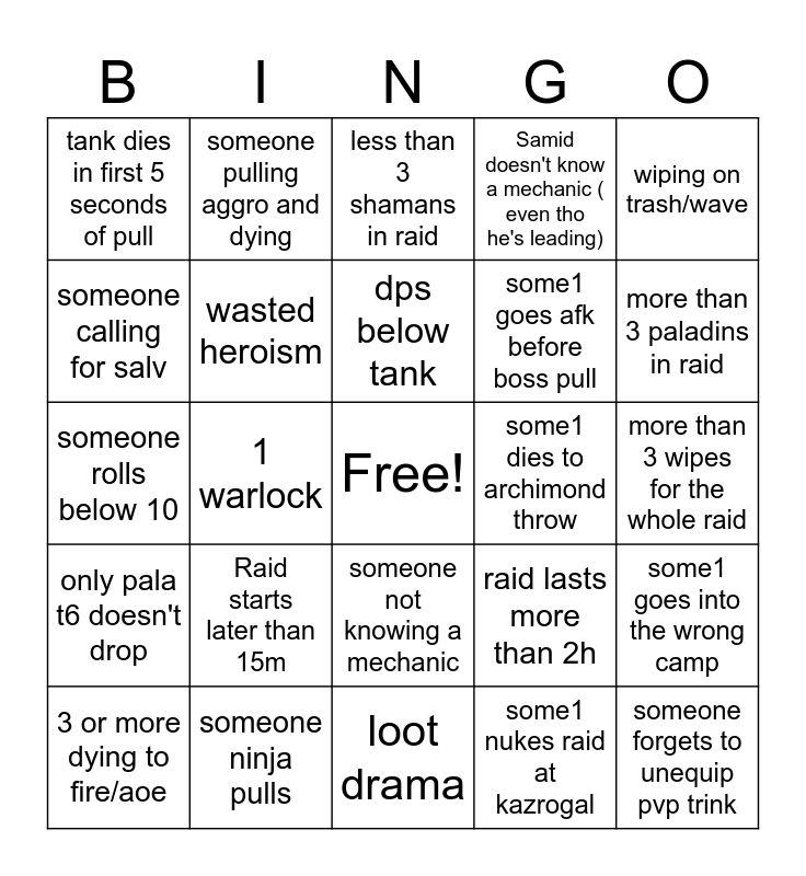 This bingo card has a free space and 24 words: Raid starts later than 15m, someone ninja pulls, dps below tank, 3 or more dying to fire/aoe, wiping on trash/wave, tank dies in first 5 seconds of pull, someone calling for salv, someone pulling aggro and dying, some1 dies to archimond throw, someone not knowing a mechanic, some1 goes afk before boss pull, someone rolls below 10, raid lasts more than 2h, some1 goes into the wrong camp, wasted heroism, some1 nukes raid at kazrogal, more than 3 wipes for the whole raid, less than 3 shamans in raid, more than 3 paladins in raid, 1 warlock, someone forgets to unequip pvp trink, only pala t6 doesn't drop, Samid doesn't know a mechanic ( even tho he's leading) and loot drama.