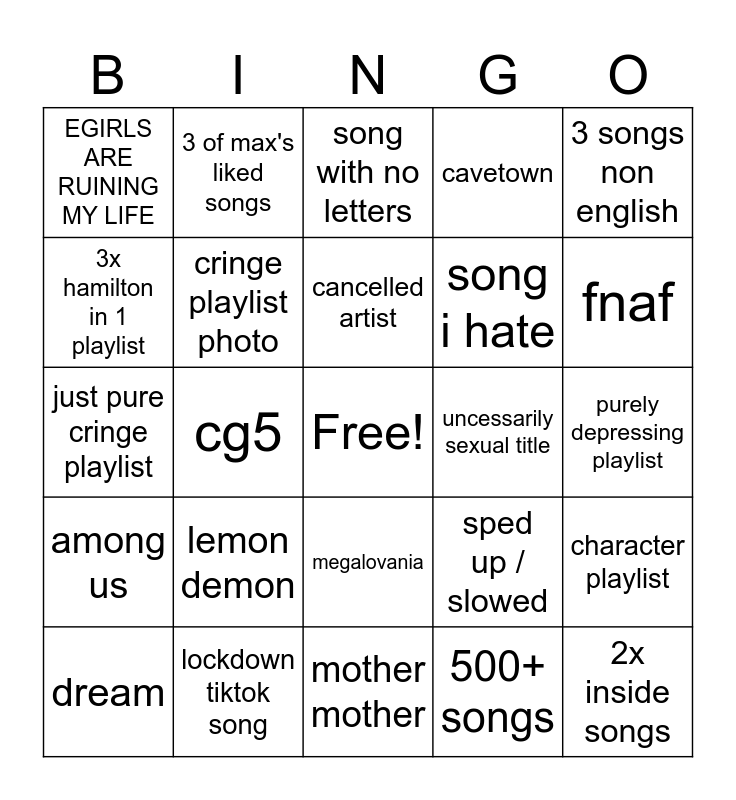 This bingo card has a free space and 24 words: lemon demon, lockdown tiktok song, cancelled artist, dream, 3 songs non english, EGIRLS ARE RUINING MY LIFE, 3x hamilton in 1 playlist, 3 of max's liked songs, uncessarily sexual title, megalovania, song i hate, just pure cringe playlist, sped up / slowed, character playlist, cringe playlist photo, 500+ songs, purely depressing playlist, song with no letters, fnaf, cg5, 2x inside songs, among us, cavetown and mother mother.