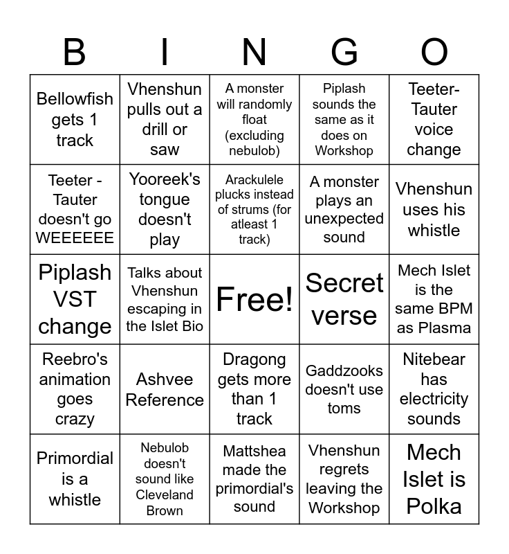 This bingo card has a free space and 24 words: Primordial is a whistle, Ashvee Reference, Arackulele plucks instead of strums (for atleast 1 track), Vhenshun regrets leaving the Workshop, Teeter-Tauter voice change, Bellowfish gets 1 track, Vhenshun pulls out a drill or saw, A monster will randomly float (excluding nebulob), Secret verse, Mech Islet is the same BPM as Plasma, Piplash VST change, Yooreek's tongue doesn't play, Gaddzooks doesn't use toms, Nitebear has electricity sounds, Teeter -Tauter doesn't go WEEEEEE, Nebulob doesn't sound like Cleveland Brown, Mattshea made the primordial's sound, Piplash sounds the same as it does on Workshop, Vhenshun uses his whistle, Reebro's animation goes crazy, Talks about Vhenshun escaping in the Islet Bio, Dragong gets more than 1 track, A monster plays an unexpected sound and Mech Islet is Polka.
