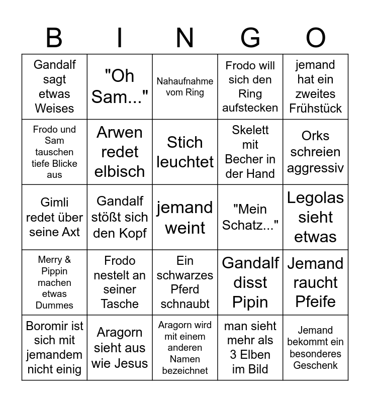 This bingo card has 25 words: Frodo nestelt an seiner Tasche, Aragorn wird mit einem anderen Namen bezeichnet, Stich leuchtet, Boromir ist sich mit jemandem nicht einig, jemand hat ein zweites Frühstück, Gandalf sagt etwas Weises, Frodo und Sam tauschen tiefe Blicke aus, "Oh Sam...", "Mein Schatz...", Ein schwarzes Pferd schnaubt, Skelett mit Becher in der Hand, Gimli redet über seine Axt, Gandalf disst Pipin, Jemand raucht Pfeife, Arwen redet elbisch, Jemand bekommt ein besonderes Geschenk, Legolas sieht etwas, Nahaufnahme vom Ring, Orks schreien aggressiv, Gandalf stößt sich den Kopf, jemand weint, Aragorn sieht aus wie Jesus, Merry & Pippin machen etwas Dummes, Frodo will sich den Ring aufstecken and man sieht mehr als 3 Elben im Bild.