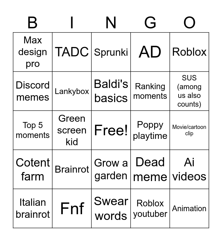 This bingo card has a free space and 24 words: Brainrot, Fnf, Baldi's basics, Italian brainrot, Roblox, Max design pro, Discord memes, TADC, Poppy playtime, Grow a garden, Ranking moments, Top 5 moments, Dead meme, Ai videos, Lankybox, Roblox youtuber, Movie/cartoon clip, Sprunki, SUS (among us also counts), Green screen kid, Animation, Cotent farm, AD and Swear words.