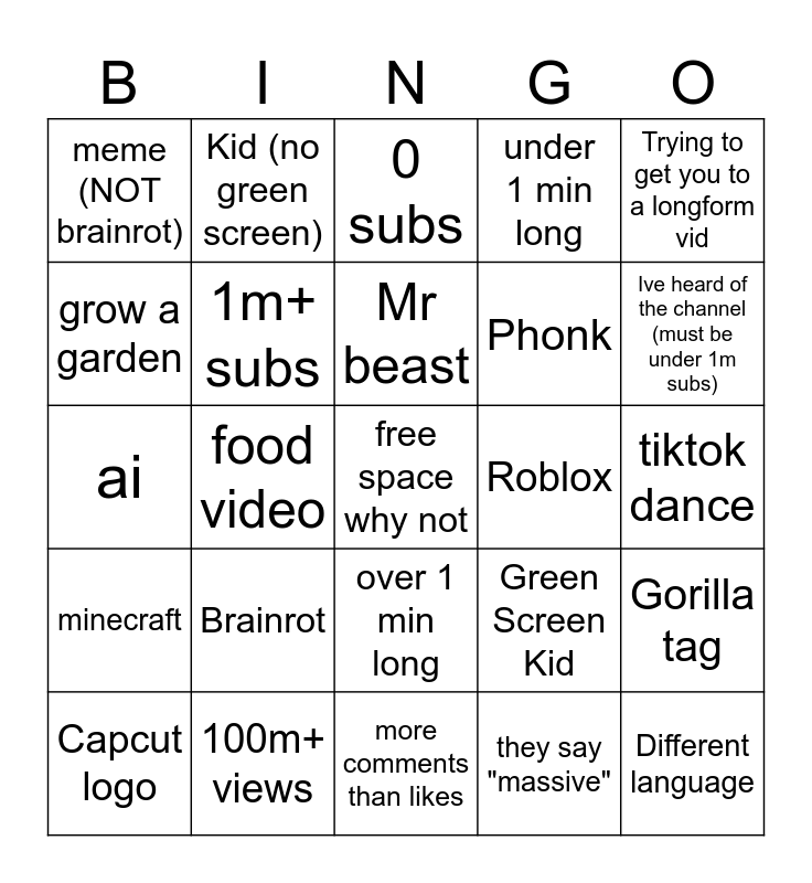 This bingo card has a free space and 24 words: Brainrot, 100m+ views, Mr beast, Capcut logo, Trying to get you to a longform vid, meme (NOT brainrot), grow a garden, Kid (no green screen), Roblox, over 1 min long, Phonk, ai, Green Screen Kid, Gorilla tag, 1m+ subs, they say "massive", tiktok dance, 0 subs, Ive heard of the channel (must be under 1m subs), food video, Different language, minecraft, under 1 min long and more comments than likes.