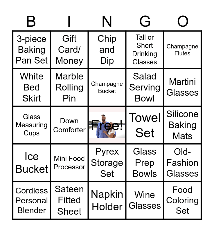 This bingo card has a free space and 24 words: Cordless Personal Blender, Mini Food Processor, Champagne Bucket, Wine Glasses, Champagne Flutes, 3-piece Baking Pan Set, Gift Card/ Money, Chip and Dip, Towel Set, Silicone Baking Mats, Glass Measuring Cups, Marble Rolling Pin, Glass Prep Bowls, Old-Fashion Glasses, White Bed Skirt, Sateen Fitted Sheet, Napkin Holder, Tall or Short Drinking Glasses, Martini Glasses, Ice Bucket, Down Comforter, Pyrex Storage Set, Salad Serving Bowl and Food Coloring Set.