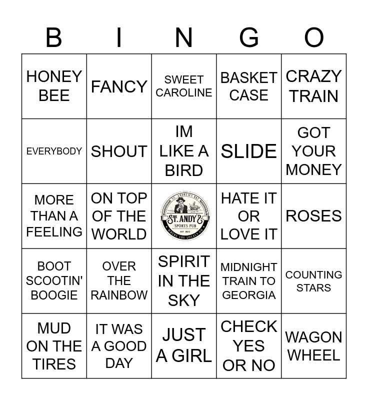 This bingo card has a free space and 54 words: LIVIN' ON A PRAYER, ON TOP OF THE WORLD, FISHIN' IN THE DARK, PARADISE CITY, ROSES, LOCKED OUT OF HEAVEN, SHOUT, HOW YOU REMIND ME, BASKET CASE, WONDERWALL, HONEY BEE, THE WAY I AM, CHECK YES OR NO, COUNTING STARS, LONELY BOY, IT WAS A GOOD DAY, JUST A GIRL, SLIDE, ONE MAN BAND, MUD ON THE TIRES, OVER THE RAINBOW, SPIRIT IN THE SKY, HATE IT OR LOVE IT, CRAZY TRAIN, BREAK YA NECK, FANCY, HANGIN' TOUGH, I WILL SURVIVE, FIREFLIES, LOVE SHACK, I LOVE IT, AM I WRONG, REDNECK WOMAN, STAND BY ME, EVERYBODY, DRIVE, IM LIKE A BIRD, MIDNIGHT TRAIN TO GEORGIA, WAGON WHEEL, MORE THAN A FEELING, VIDEO, STARSHIPS, AMERICAN WOMAN, LOVE TRAIN, AIRPLANES, LET IT GO, HEART OF GOLD, WE GOT THE BEAT, GOT YOUR MONEY, BOOT SCOOTIN' BOOGIE, SWEET CAROLINE, CRAZY, SMELLS LIKE TEEN SPIRIT and HYPNOTIZE.