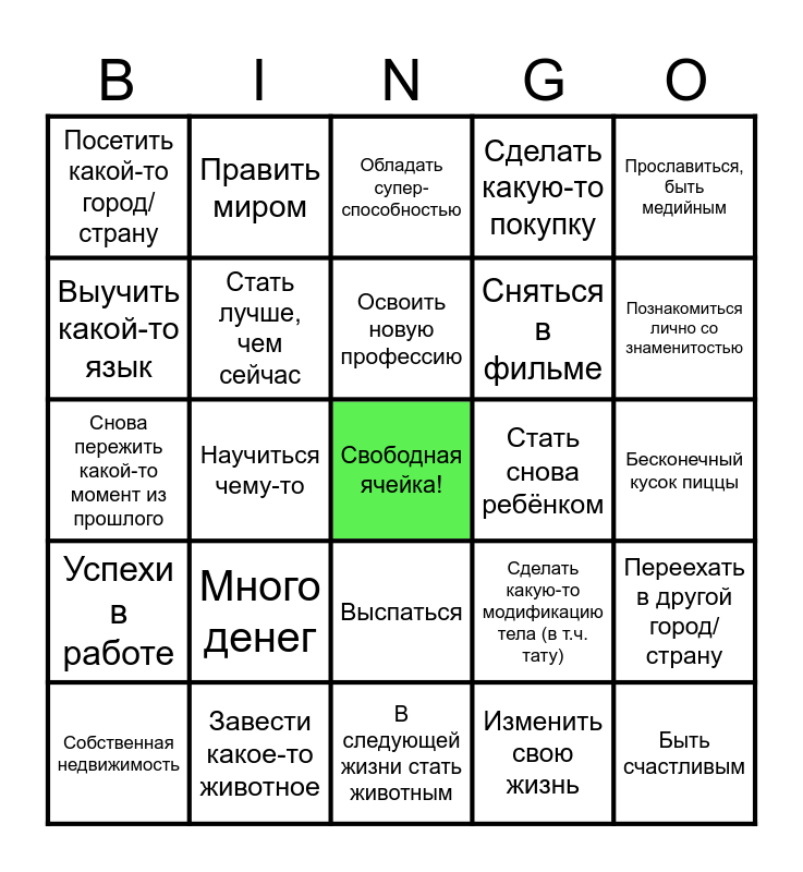 This bingo card has a free space and 24 words: Много денег, Завести какое-то животное, Освоить новую профессию, Собственная недвижимость, Прославиться, быть медийным, Посетить какой-то город/страну, Выучить какой-то язык, Править миром, Стать снова ребёнком, Выспаться, Сняться в фильме, Снова пережить какой-то момент из прошлого, Сделать какую-то модификацию тела (в т.ч. тату), Переехать в другой город/страну, Стать лучше, чем сейчас, Изменить свою жизнь, Бесконечный кусок пиццы, Обладать супер-способностью, Познакомиться лично со знаменитостью, Научиться чему-то, Быть счастливым, Успехи в работе, Сделать какую-то покупку and В следующей жизни стать животным.