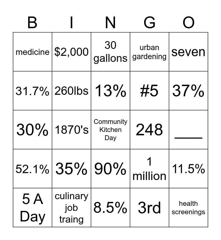 This bingo card has a free space and 24 words: 5 A Day, 35%, 13%, 3rd, seven, medicine, $2,000, 30 gallons, 248, ___, 30%, 260lbs, 1 million, 11.5%, 31.7%, culinary job traing, 8.5%, urban gardening, 37%, 52.1%, 1870's, 90%, #5 and health screenings.