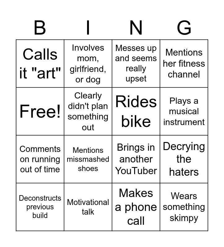 This bingo card has 16 words: Motivational talk, Decrying the haters, Messes up and seems really upset, Calls it "art", Comments on running out of time, Involves mom, girlfriend, or dog, Brings in another YouTuber, Makes a phone call, Free!, Clearly didn't plan something out, Deconstructs previous build, Mentions her fitness channel, Mentions missmashed shoes, Plays a musical instrument, Rides bike and Wears something skimpy.