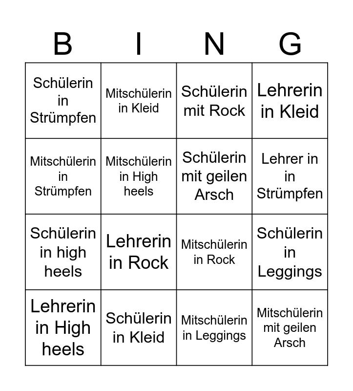 This bingo card has 16 words: Schülerin in Kleid, Schülerin in Leggings, Schülerin mit Rock, Schülerin in Strümpfen, Schülerin in high heels, Mitschülerin in Kleid, Mitschülerin in Rock, Mitschülerin in Leggings, Mitschülerin in Strümpfen, Mitschülerin in High heels, Lehrerin in High heels, Lehrerin in Kleid, Lehrerin in Rock, Lehrer in in Strümpfen, Schülerin mit geilen Arsch and Mitschülerin mit geilen Arsch.