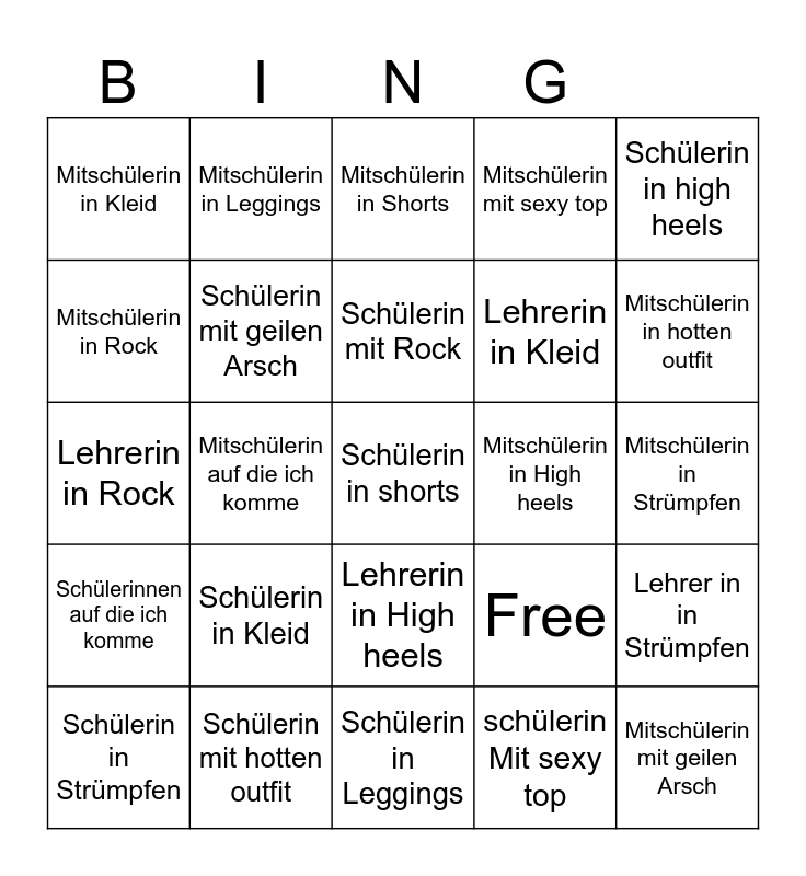 This bingo card has 25 words: Schülerin in Kleid, Schülerin in Leggings, Schülerin mit Rock, Schülerin in Strümpfen, Schülerin in high heels, Mitschülerin in Kleid, Mitschülerin in Rock, Mitschülerin in Leggings, Mitschülerin in High heels, Lehrerin in High heels, Lehrerin in Kleid, Lehrerin in Rock, Free, Lehrer in in Strümpfen, Schülerin mit geilen Arsch, Mitschülerin mit geilen Arsch, Mitschülerin in Strümpfen, Mitschülerin in Shorts, Mitschülerin in hotten outfit, Mitschülerin auf die ich komme, Schülerin in shorts, Schülerin mit hotten outfit, Schülerinnen auf die ich komme, Mitschülerin mit sexy top and schülerin Mit sexy top.
