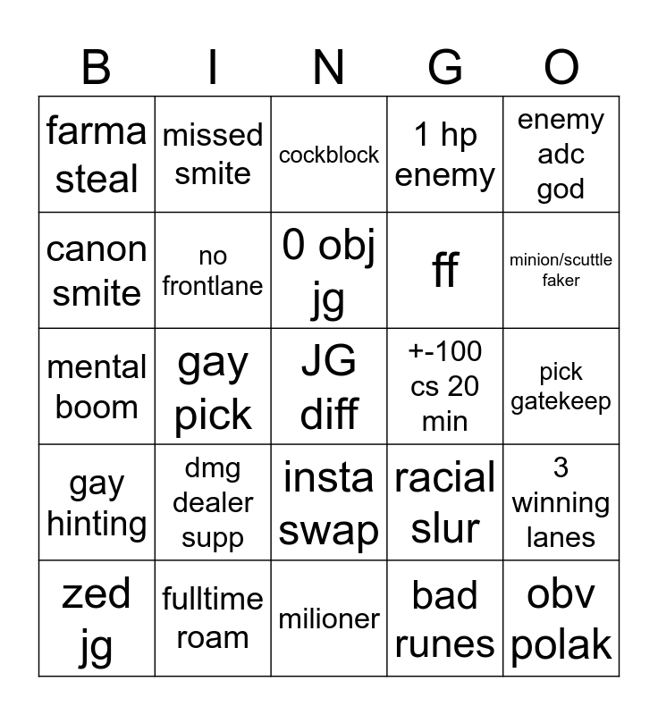 This bingo card has a free space and 24 words: dmg dealer supp, fulltime roam, 0 obj jg, zed jg, enemy adc god, farma steal, canon smite, missed smite, +-100 cs 20 min, insta swap, ff, mental boom, racial slur, 3 winning lanes, no frontlane, bad runes, pick gatekeep, cockblock, minion/scuttle faker, gay pick, obv polak, gay hinting, 1 hp enemy and milioner.