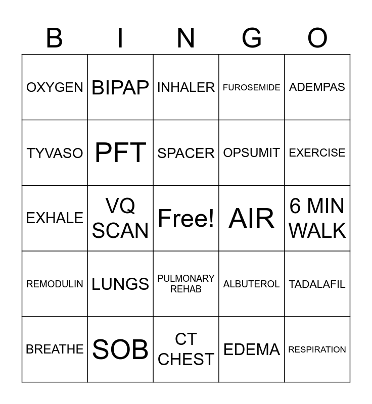 This bingo card has a free space and 24 words: LUNGS, SOB, SPACER, BREATHE, ADEMPAS, OXYGEN, TYVASO, BIPAP, AIR, PULMONARY REHAB, OPSUMIT, EXHALE, ALBUTEROL, TADALAFIL, PFT, EDEMA, 6 MIN WALK, INHALER, EXERCISE, VQ SCAN, RESPIRATION, REMODULIN, FUROSEMIDE and CT CHEST.