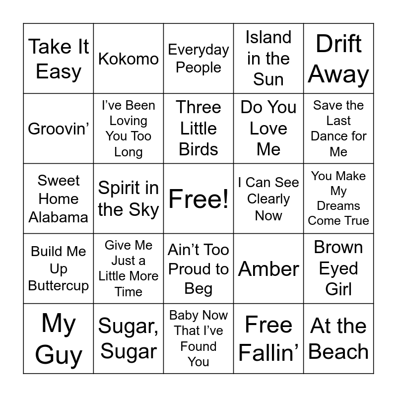 This bingo card has a free space and 49 words: Paddle to the Stars, At the Beach, I Love Beach Music, Baby Now That I’ve Found You, Give Me Just a Little More Time, Sittin’ on the Dock of the Bay, Kokomo, Under the Boardwalk, Groovin’, Walk On By, I’ve Been Loving You Too Long, Island in the Sun, Brown Eyed Girl, Amber, Wouldn’t It Be Nice, Surfin’ USA, Three Little Birds, I Can See Clearly Now, Banana Boat, Drift Away, Spirit in the Sky, Free Fallin’, Take It Easy, Do You Love Me, This Magic Moment, Save the Last Dance for Me, My Guy, Sh-Boom, Ain’t Too Proud to Beg, Build Me Up Buttercup, Summer Nights, Walking on Sunshine, Wipe Out, Tequila, Sugar, Sugar, I Can’t Help Myself, Do You Believe in Magic, My Girl, You Make My Dreams Come True, I Got You (I Feel Good), Summer, Cruel Summer, Lovely Day, Dancing in the Moonlight, Sweet Home Alabama, Everyday People, You Can Get It If You Really Want It, I’m a Believer and Summer - Marshmellow.