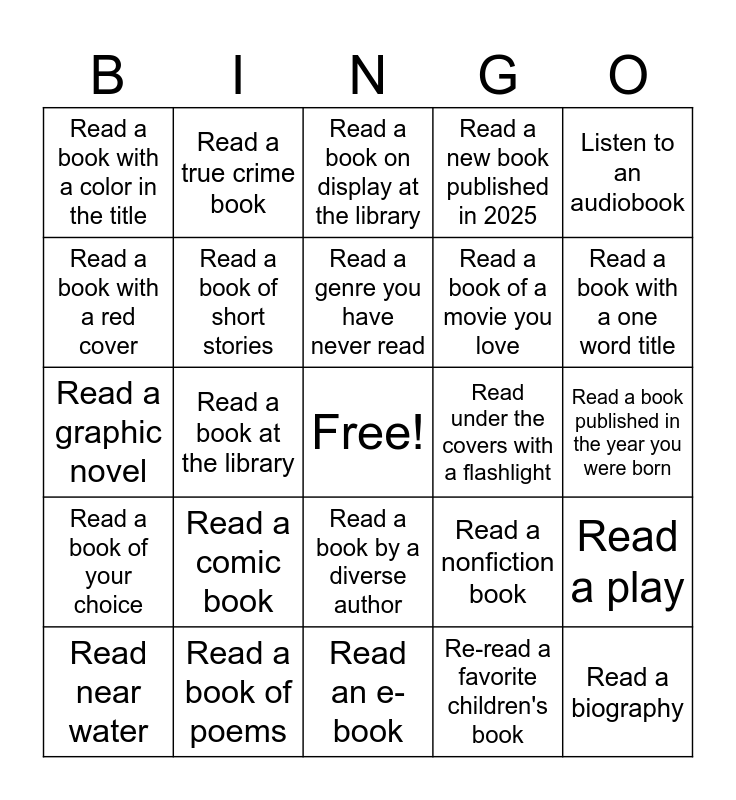 This bingo card has a free space and 24 words: Read a comic book, Read a book of poems, Read a genre you have never read, Read near water, Listen to an audiobook, Read a book with a color in the title, Read a book with a red cover, Read a true crime book, Read under the covers with a flashlight, Read a book by a diverse author, Read a book of a movie you love, Read a graphic novel, Read a nonfiction book, Read a play, Read a book of short stories, Re-read a favorite children's book, Read a book published in the year you were born, Read a book on display at the library, Read a book with a one word title, Read a book at the library, Read a biography, Read a book of your choice, Read a new book published in 2025 and Read an e-book.