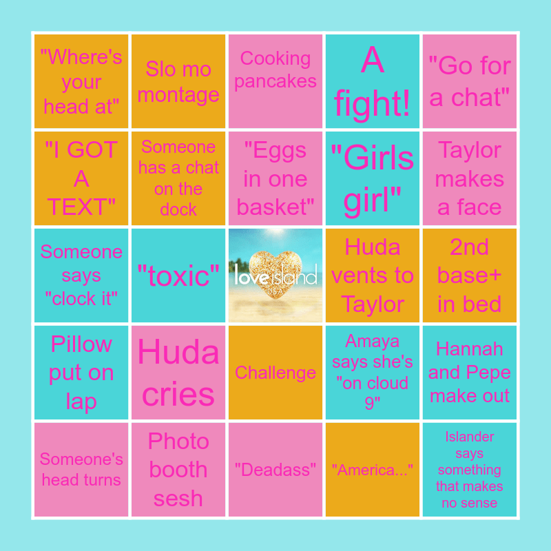 This bingo card has a free space and 24 words: Huda cries, Photo booth sesh, "Eggs in one basket", Someone's head turns, "Go for a chat", "Where's your head at", "I GOT A TEXT", Slo mo montage, Huda vents to Taylor, Challenge, "Girls girl", Someone says "clock it", Amaya says she's "on cloud 9", Hannah and Pepe make out, Someone has a chat on the dock, "America...", 2nd base+ in bed, Cooking pancakes, Taylor makes a face, "toxic", Islander says something that makes no sense, Pillow put on lap, A fight! and "Deadass".