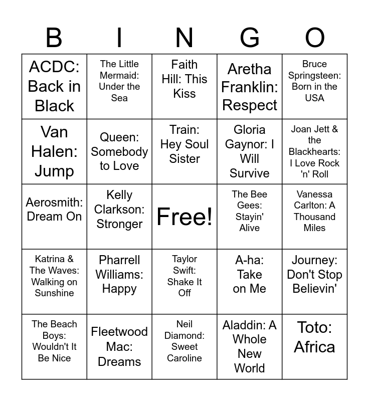 This bingo card has a free space and 32 words: Aladdin: A Whole New World, Survivor: Eye of the Tiger, Kelly Clarkson: Stronger, Tears For Fears: Everybody Wants To Rule The World, Katrina & The Waves: Walking on Sunshine, Queen: Somebody to Love, Bruce Springsteen: Born in the USA, Journey: Don't Stop Believin', The Little Mermaid: Under the Sea, BOB: Magic, Train: Hey Soul Sister, Faith Hill: This Kiss, Katy Perry: Roar, Bon Jovi: Livin' on a Prayer, The Bee Gees: Stayin' Alive, Natasha Bedingfield: Pocketful of Sunshine, The Beach Boys: Wouldn't It Be Nice, Aerosmith: Dream On, Taylor Swift: Shake It Off, Pharrell Williams: Happy, A-ha: Take on Me, Toy Story: You've Got a Friend in Me, Vanessa Carlton: A Thousand Miles, Fleetwood Mac: Dreams, Toto: Africa, Aretha Franklin: Respect, Gloria Gaynor: I Will Survive, Van Halen: Jump, ACDC: Back in Black, Neil Diamond: Sweet Caroline, Whitney Houston: I Wanna Dance with Sombody and Joan Jett & the Blackhearts: I Love Rock 'n' Roll.
