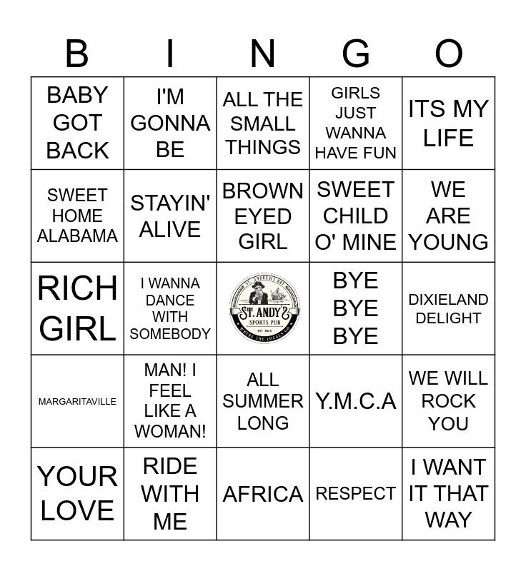 This bingo card has a free space and 52 words: DONT STOP BELIEVIN', I WANT IT THAT WAY, CALL ME MAYBE, AFRICA, MAN! I FEEL LIKE A WOMAN!, YOURE THE ONE THAT I WANT, I'M GONNA BE, STACYS MOM, SWEET HOME ALABAMA, PARTY IN THE USA, STAYIN' ALIVE, TAKE ME HOME, COUNTRY ROADS, WE WILL ROCK YOU, Y.M.C.A, AMERICAN PIE, ALL STAR, BROWN EYED GIRL, BYE BYE BYE, WANNABE, ITS MY LIFE, I WANNA DANCE WITH SOMEBODY, RESPECT, BABY GOT BACK, SWEET CHILD O' MINE, FOLLOW ME, JACK & DIANE, MY GIRL, RETURN OF THE MACK, WE ARE YOUNG, THANK GOD IM A COUNTRY BOY, CHICKEN FRIED, GIRLS JUST WANNA HAVE FUN, MR. BRIGHTSIDE, UPTOWN FUNK, SHAKE IT OFF, ALL THE SMALL THINGS, RIDE WITH ME, IT WASNT ME, SEPTEMBER, CELEBRATION, WE ARE FAMILY, DIXIELAND DELIGHT, MARGARITAVILLE, IVE GOT FRIENDS IN LOW PLACES, ALL SUMMER LONG, OLD TIME ROCK AND ROLL, SUMMER OF '69, RICH GIRL, BUILD ME UP BUTTERCUP, COME AND GET YOUR LOVE, YOUR LOVE and THIS IS HOW WE DO IT.