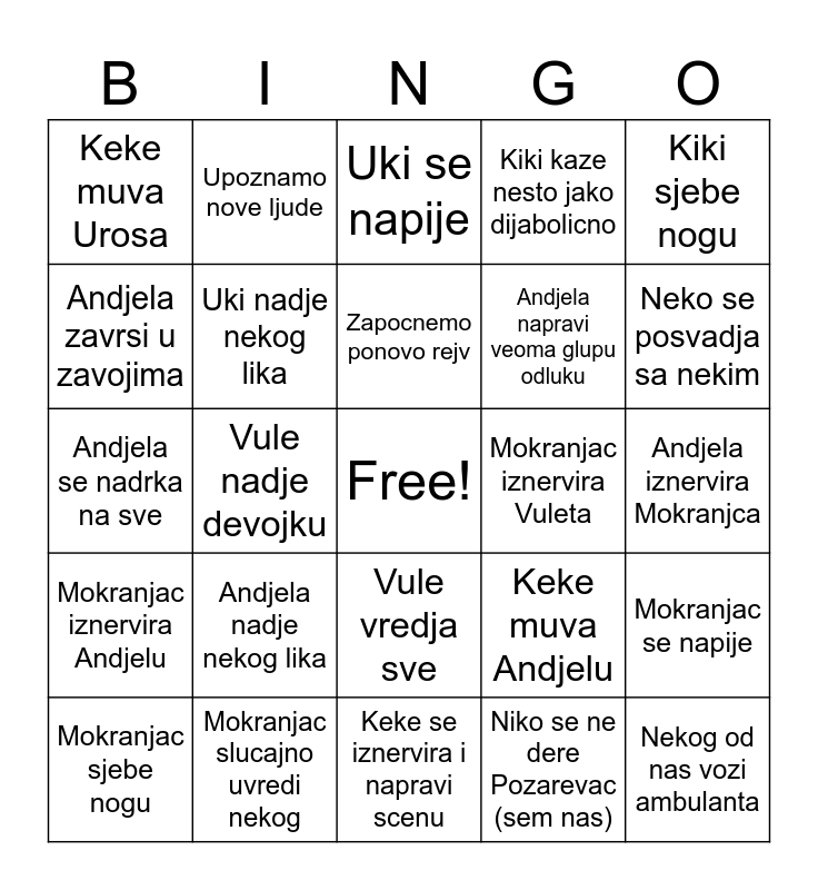 This bingo card has a free space and 24 words: Andjela nadje nekog lika, Mokranjac slucajno uvredi nekog, Zapocnemo ponovo rejv, Mokranjac sjebe nogu, Kiki sjebe nogu, Keke muva Urosa, Andjela zavrsi u zavojima, Upoznamo nove ljude, Mokranjac iznervira Vuleta, Vule vredja sve, Andjela napravi veoma glupu odluku, Andjela se nadrka na sve, Keke muva Andjelu, Mokranjac se napije, Uki nadje nekog lika, Niko se ne dere Pozarevac (sem nas), Andjela iznervira Mokranjca, Uki se napije, Neko se posvadja sa nekim, Vule nadje devojku, Nekog od nas vozi ambulanta, Mokranjac iznervira Andjelu, Kiki kaze nesto jako dijabolicno and Keke se iznervira i napravi scenu.