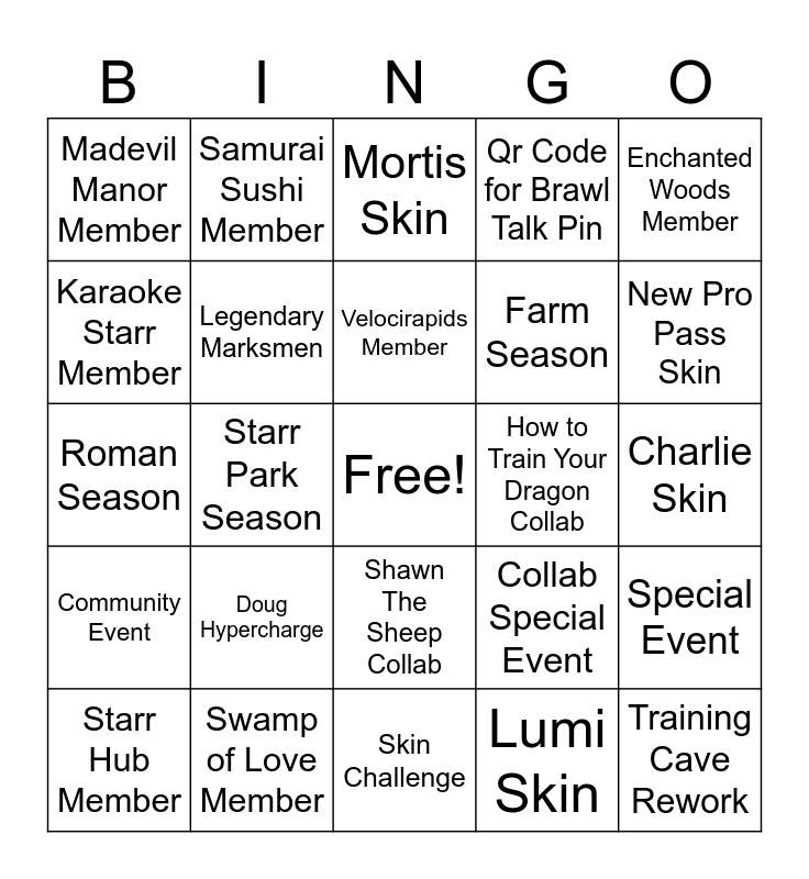This bingo card has a free space and 24 words: Doug Hypercharge, Swamp of Love Member, Velocirapids Member, Starr Hub Member, Enchanted Woods Member, Madevil Manor Member, Karaoke Starr Member, Samurai Sushi Member, How to Train Your Dragon Collab, Shawn The Sheep Collab, Farm Season, Roman Season, Collab Special Event, Special Event, Legendary Marksmen, Lumi Skin, Charlie Skin, Mortis Skin, New Pro Pass Skin, Starr Park Season, Training Cave Rework, Community Event, Qr Code for Brawl Talk Pin and Skin Challenge.