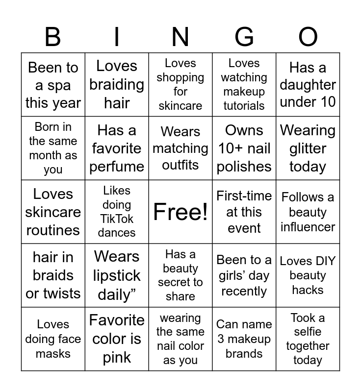This bingo card has a free space and 24 words: Wears lipstick daily”, Favorite color is pink, Wears matching outfits, Loves doing face masks, Has a daughter under 10, Been to a spa this year, Born in the same month as you, Loves braiding hair, First-time at this event, Has a beauty secret to share, Owns 10+ nail polishes, Loves skincare routines, Been to a girls’ day recently, Loves DIY beauty hacks, Has a favorite perfume, Can name 3 makeup brands, Follows a beauty influencer, Loves shopping for skincare, Wearing glitter today, Likes doing TikTok dances, Took a selfie together today, hair in braids or twists, Loves watching makeup tutorials and wearing the same nail color as you.