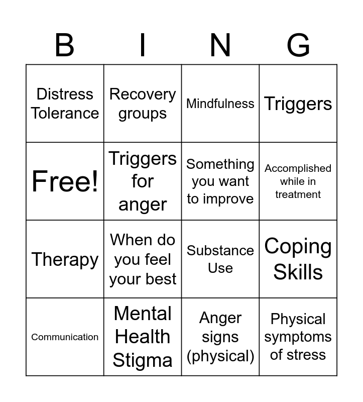 This bingo card has 16 words: Mental Health Stigma, Coping Skills, Mindfulness, Distress Tolerance, Therapy, Recovery groups, Substance Use, Anger signs (physical), Free!, Triggers for anger, Communication, Triggers, When do you feel your best, Accomplished while in treatment, Something you want to improve and Physical symptoms of stress.