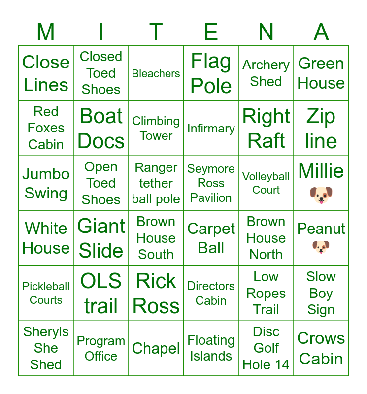 This bingo card has 48 words: Fire Circle, Jumbo Swing, Creative Arts, Brown House North, Volleyball Court, Directors Cabin, Closed Toed Shoes, The Cove Cabin, Green House, Program Office, Red Foxes Cabin, Flag Pole, Giant Slide, White House, Crows Cabin, Rick Ross, Boat Docs, Open Toed Shoes, Free!, Archery Shed, Zip line, Peanut 🐶, Close Lines, Climbing Tower, Riflery Trail, Infirmary, Brown House South, Falcons Cabin, Millie 🐶, Seymore Ross Pavilion, Sportsfield Rules Sign, OLS trail, Disc Golf Hole 14, Ninja Course, Carpet Ball, Chapel, Floating Islands, Ranger tether ball pole, Sheryls She Shed, LIT cabin, Low Ropes Trail, Pickleball Courts, Bleachers, Baseball Diamond, Right Raft, Disc Golf Hole 4, Slow Boy Sign and Sports shed.