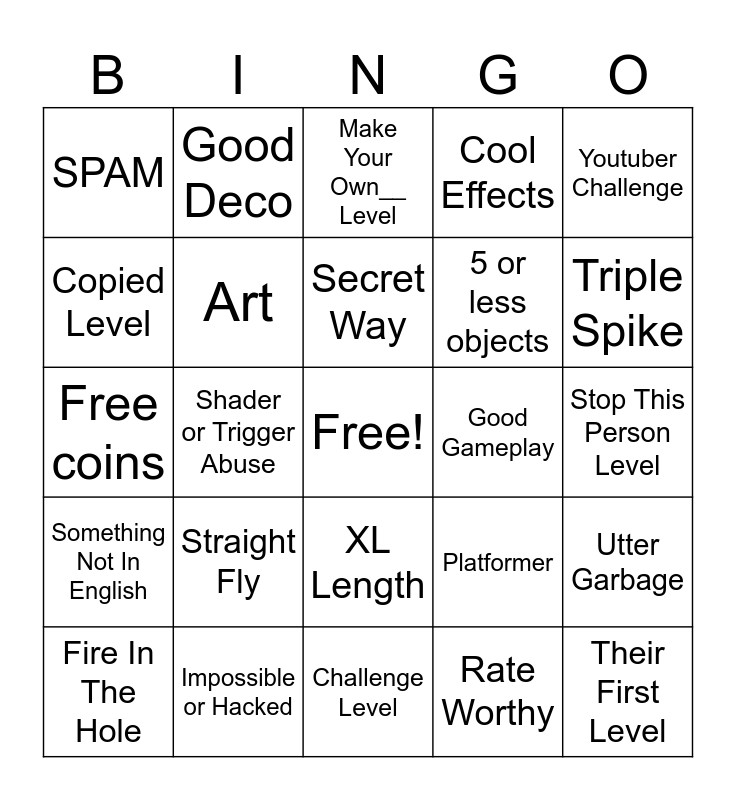 This bingo card has a free space and 24 words: Straight Fly, Impossible or Hacked, Secret Way, Fire In The Hole, Youtuber Challenge, SPAM, Copied Level, Good Deco, Good Gameplay, XL Length, 5 or less objects, Free coins, Platformer, Utter Garbage, Art, Rate Worthy, Stop This Person Level, Make Your Own__ Level, Triple Spike, Shader or Trigger Abuse, Their First Level, Something Not In English, Cool Effects and Challenge Level.