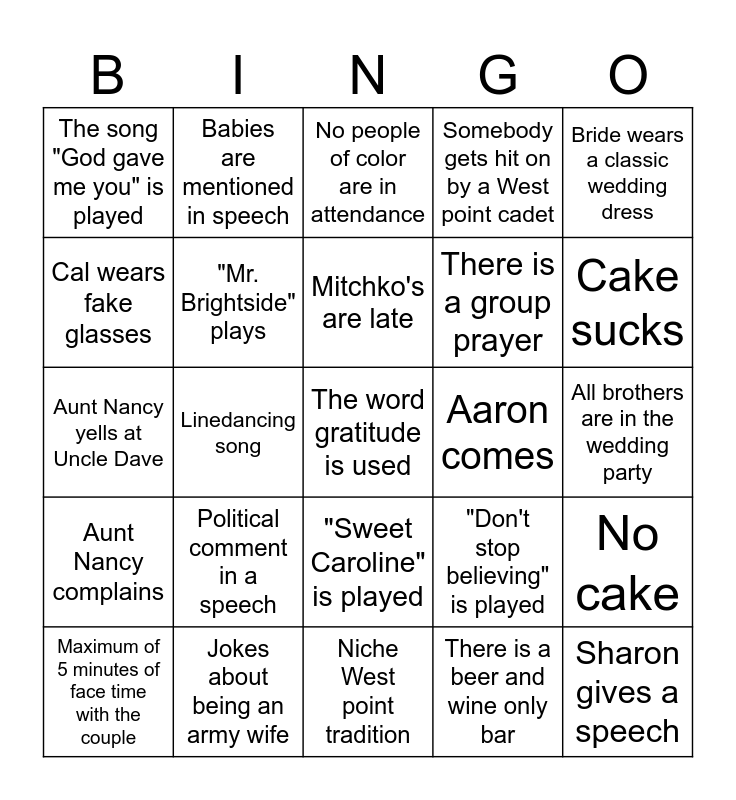 This bingo card has a free space and 24 words: Political comment in a speech, Jokes about being an army wife, Mitchko's are late, Maximum of 5 minutes of face time with the couple, Bride wears a classic wedding dress, The song "God gave me you" is played, Cal wears fake glasses, Babies are mentioned in speech, Aaron comes, "Sweet Caroline" is played, There is a group prayer, Aunt Nancy yells at Uncle Dave, "Don't stop believing" is played, No cake, "Mr. Brightside" plays, There is a beer and wine only bar, All brothers are in the wedding party, No people of color are in attendance, Cake sucks, Linedancing song, Sharon gives a speech, Aunt Nancy complains, Somebody gets hit on by a West point cadet and Niche West point tradition.