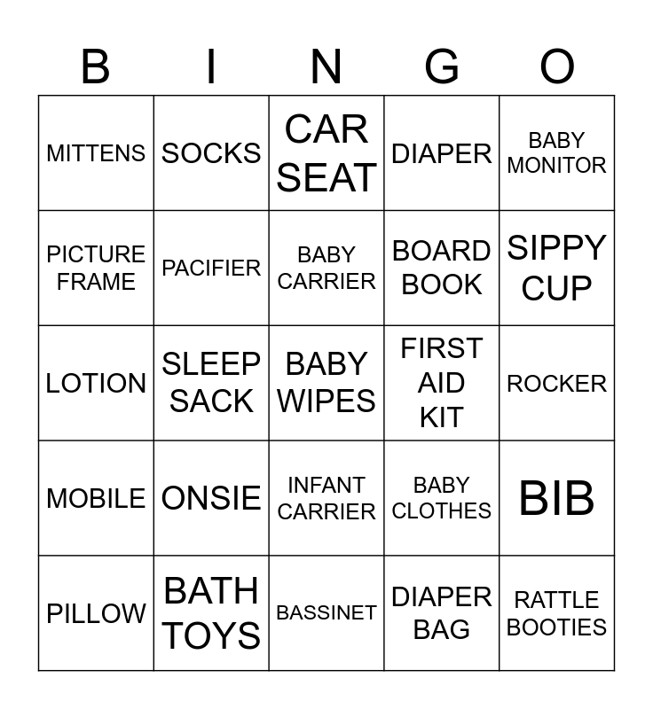 This bingo card has 50 words: Free!, BABY WIPES, BABY SHAMPOO, BASSINET, ONSIE, BABY POWDER, SOCKS, DIAPER PAIL, PICTURE FRAME, STROLLER, PACIFIER, DIAPER, BIB, BABY CLOTHES, BOUNCER, RUBBER DUCK, BABY CARRIER, FIRST AID KIT, CRIB, BABY MONITOR, SLEEP SACK, DIAPER BAG, MITTENS, BOARD BOOK, SWADDLE BLANKET, RATTLE BOOTIES, SIPPY CUP, HIGH CHAIR, CAR SEAT, INFANT CARRIER, DIAPER CREAM, SLEEPER, ROCKING HORSE, TEDDY BEAR, BATH TOYS, BABY SPOON, HOODED TOWEL, BURP CLOTH, PLAY YARD, ROCKER, BOWL, NIGHT LIGHT, CHANGING PAD, BATH TUB, PILLOW, LOTION, BABY BOTTLE, BABY SOAP, MOBILE and BOTTLE WARMER.