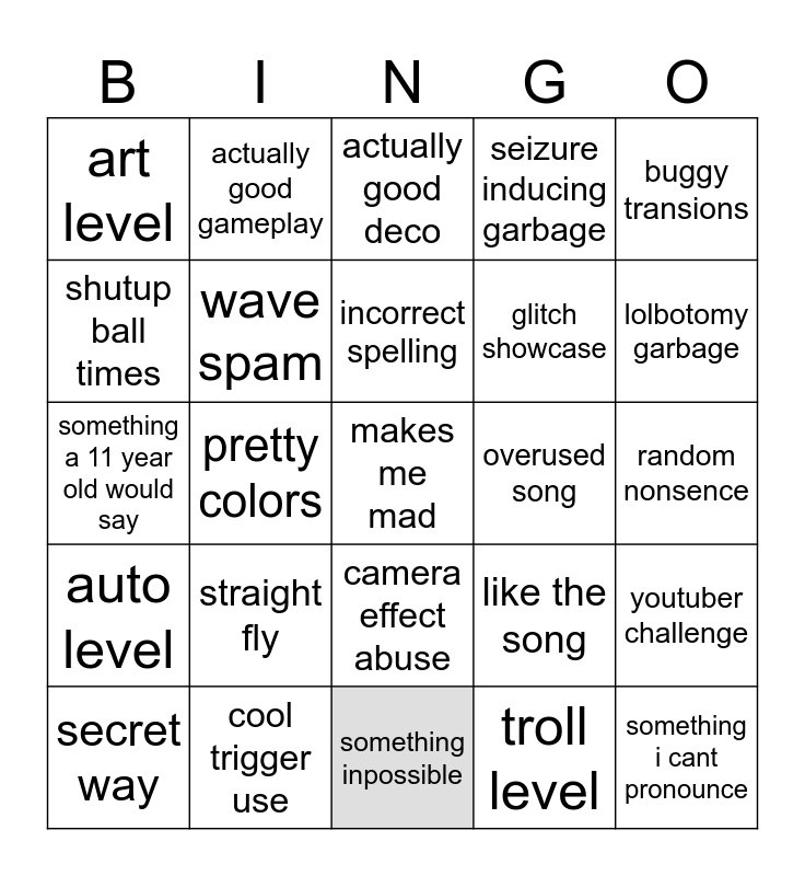 This bingo card has a free space and 24 words: straight fly, cool trigger use, incorrect spelling, secret way, buggy transions, art level, shutup ball times, actually good gameplay, overused song, camera effect abuse, glitch showcase, something a 11 year old would say, like the song, youtuber challenge, wave spam, troll level, random nonsence, actually good deco, lolbotomy garbage, pretty colors, something i cant pronounce, auto level, seizure inducing garbage and something inpossible.