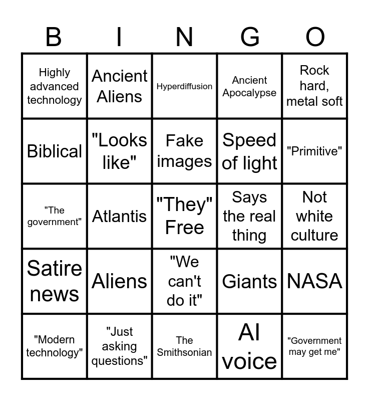 This bingo card has a free space and 24 words: Aliens, "Just asking questions", Fake images, "Modern technology", Rock hard, metal soft, Highly advanced technology, Biblical, Ancient Aliens, Says the real thing, "We can't do it", Speed of light, "The government", Giants, NASA, "Looks like", AI voice, Not white culture, Hyperdiffusion, "Primitive", Atlantis, "Government may get me", Satire news, Ancient Apocalypse and The Smithsonian.