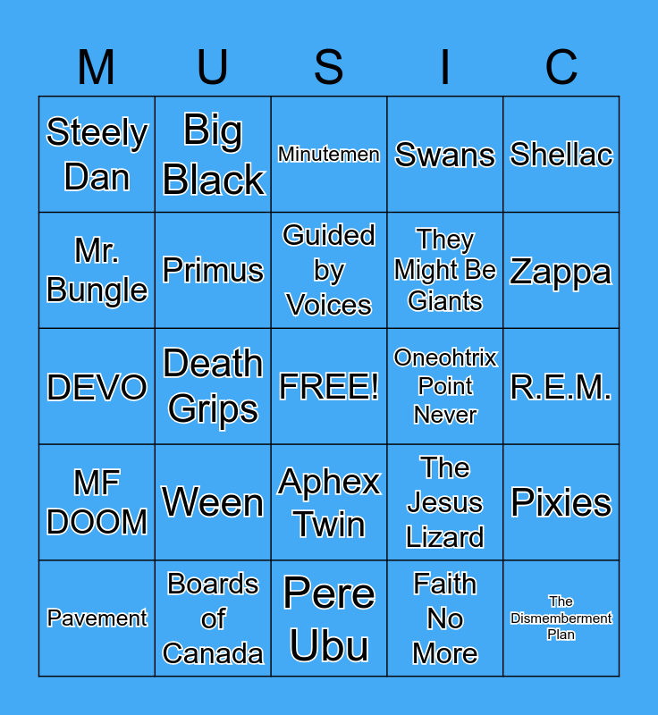This bingo card has a free space and 24 words: Ween, Boards of Canada, Guided by Voices, Pavement, Shellac, Steely Dan, Mr. Bungle, Big Black, Oneohtrix Point Never, Aphex Twin, They Might Be Giants, DEVO, The Jesus Lizard, Pixies, Primus, Faith No More, R.E.M., Minutemen, Zappa, Death Grips, The Dismemberment Plan, MF DOOM, Swans and Pere Ubu.