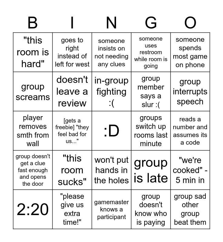 This bingo card has a free space and 24 words: "this room sucks", "please give us extra time!", in-group fighting :(, 2:20, someone spends most game on phone, "this room is hard", group screams, goes to right instead of left for west, groups switch up rooms last minute, won't put hands in the holes, group member says a slur :(, player removes smth from wall, group is late, "we're cooked" - 5 min in, doesn't leave a review, group doesn't know who is paying, reads a number and assumes its a code, someone insists on not needing any clues, group interrupts speech, [gets a freebie] "they feel bad for us...", group sad other group beat them, group doesn't get a clue fast enough and opens the door, someone uses restroom while room is going and gamemaster knows a participant.