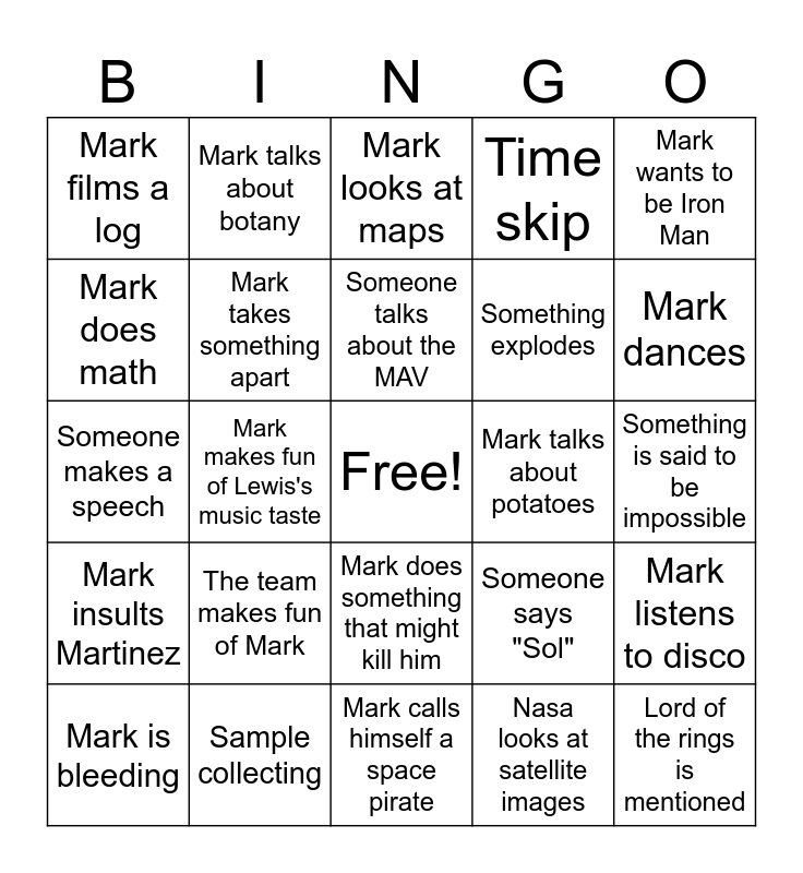 This bingo card has a free space and 24 words: The team makes fun of Mark, Sample collecting, Someone talks about the MAV, Mark is bleeding, Mark wants to be Iron Man, Mark films a log, Mark does math, Mark talks about botany, Mark talks about potatoes, Mark does something that might kill him, Something explodes, Someone makes a speech, Someone says "Sol", Mark listens to disco, Mark takes something apart, Nasa looks at satellite images, Something is said to be impossible, Mark looks at maps, Mark dances, Mark makes fun of Lewis's music taste, Lord of the rings is mentioned, Mark insults Martinez, Time skip and Mark calls himself a space pirate.