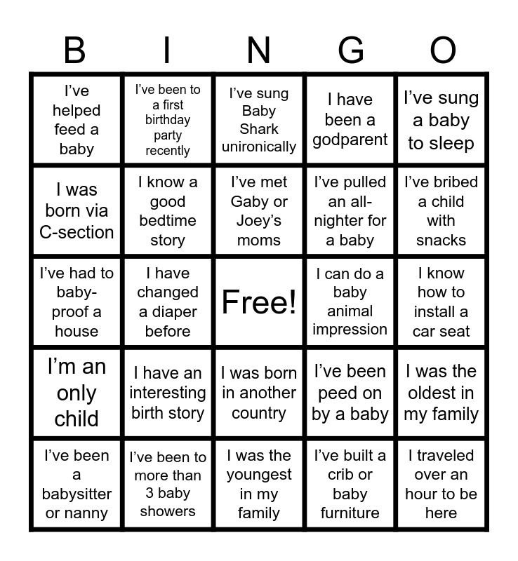 This bingo card has a free space and 24 words: I’ve been a babysitter or nanny, I have an interesting birth story, I’ve met Gaby or Joey’s moms, I’ve built a crib or baby furniture, I’ve sung a baby to sleep, I’ve helped feed a baby, I’ve been to a first birthday party recently, I’ve sung Baby Shark unironically, I can do a baby animal impression, I know how to install a car seat, I’ve had to baby-proof a house, I know a good bedtime story, I’ve been peed on by a baby, I was the oldest in my family, I was born via C-section, I’ve been to more than 3 baby showers, I was the youngest in my family, I have been a godparent, I’ve bribed a child with snacks, I’m an only child, I have changed a diaper before, I was born in another country, I’ve pulled an all-nighter for a baby and I traveled over an hour to be here.