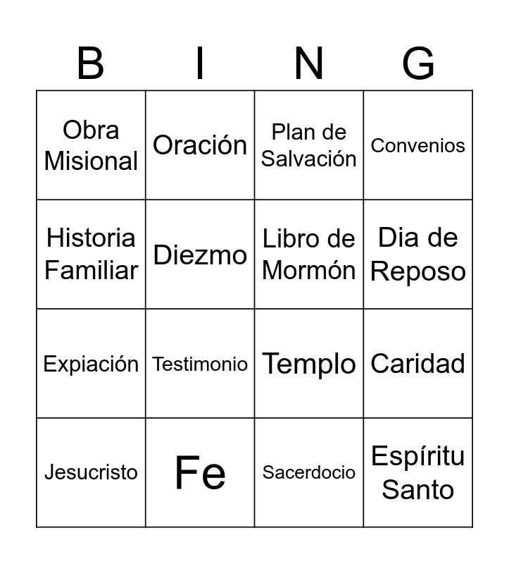 This bingo card has 16 words: Fe, Caridad, Plan de Salvación, Obra Misional, Expiación, Oración, Templo, Sacerdocio, Historia Familiar, Diezmo, Jesucristo, Convenios, Testimonio, Dia de Reposo, Libro de Mormón and Espíritu Santo.