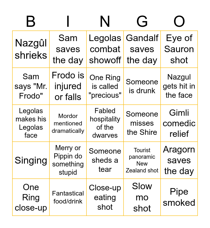 This bingo card has a free space and 24 words: Merry or Pippin do something stupid, Fantastical food/drink, One Ring is called "precious", One Ring close-up, Eye of Sauron shot, Nazgûl shrieks, Sam says "Mr. Frodo", Sam saves the day, Someone misses the Shire, Someone sheds a tear, Someone is drunk, Legolas makes his Legolas face, Tourist panoramic New Zealand shot, Aragorn saves the day, Frodo is injured or falls, Slow mo shot, Gimli comedic relief, Legolas combat showoff, Nazgul gets hit in the face, Mordor mentioned dramatically, Pipe smoked, Singing, Gandalf saves the day and Close-up eating shot.