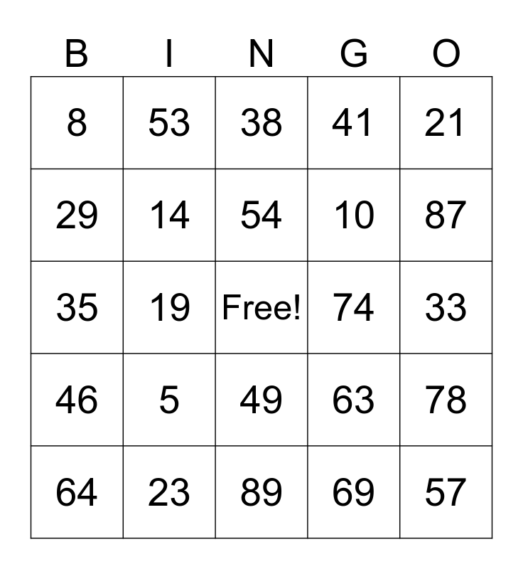 This bingo card has a free space and 24 words: 5, 23, 54, 64, 21, 8, 29, 53, 74, 49, 10, 35, 63, 78, 14, 69, 33, 38, 87, 19, 57, 46, 41 and 89.