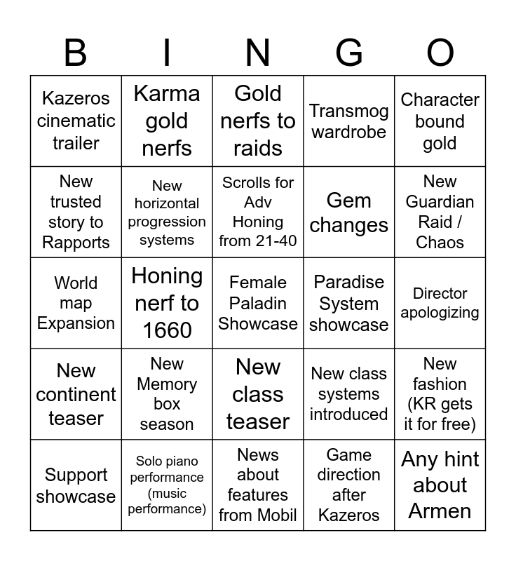 This bingo card has a free space and 24 words: New Memory box season, Solo piano performance (music performance), Scrolls for Adv Honing from 21-40, Support showcase, Character bound gold, Kazeros cinematic trailer, New trusted story to Rapports, Karma gold nerfs, Paradise System showcase, New class teaser, Gem changes, World map Expansion, New class systems introduced, New fashion (KR gets it for free), New horizontal progression systems, Game direction after Kazeros, Director apologizing, Gold nerfs to raids, New Guardian Raid / Chaos, Honing nerf to 1660, Any hint about Armen, New continent teaser, Transmog wardrobe and News about features from Mobil.