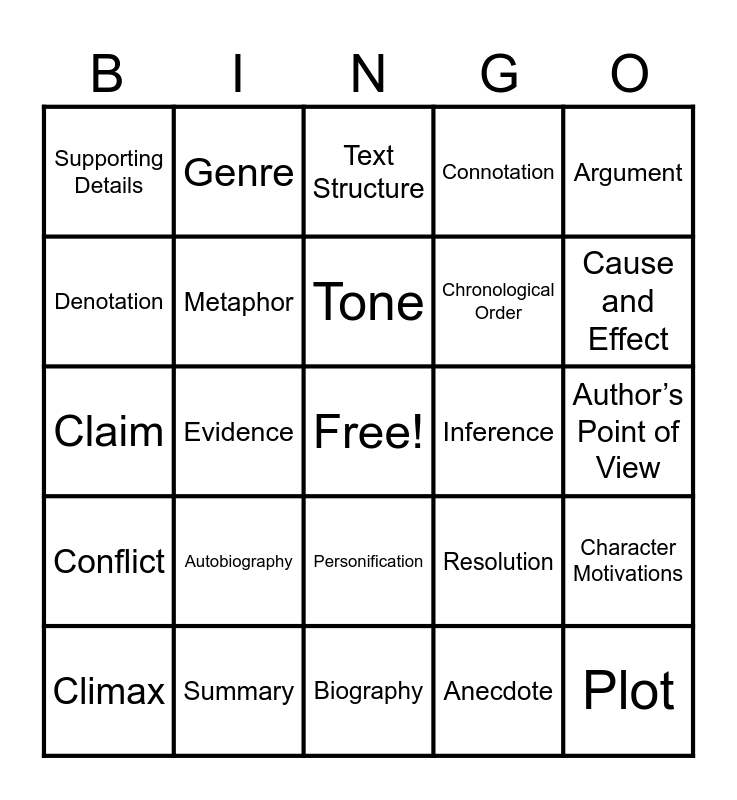 This bingo card has a free space and 35 words: Simile, Alliteration, Onomatopoeia, Metaphor, Personification, Connotation, Denotation, Mood, Tone, Author’s Purpose, Claim, Argument, Central Idea, Theme, Supporting Details, Inference, Anecdote, Evidence, Conflict, Plot, Resolution, Climax, Character Motivations, Summary, Text Structure, Cause and Effect, Problem Solution, Compare and Contrast, Chronological Order, Author’s Point of View, Evaluate, Biography, Autobiography, Genre and Rhyme Scheme.