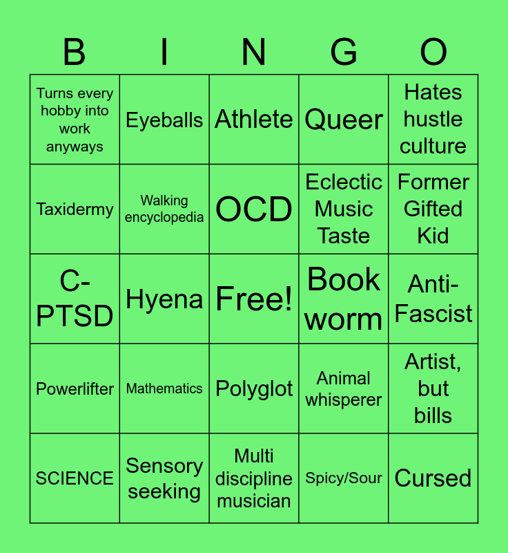 This bingo card has a free space and 26 words: Polyglot, Spicy/Sour, OCD, Sensory seeking, Hates hustle culture, Turns every hobby into work anyways, Taxidermy, Eyeballs, Anti-Fascist, Animal whisperer, Eclectic Music Taste, C-PTSD, Artist, but bills, SCIENCE, Hyena, TTRPGS, Queer, Powerlifter, Athlete, Cursed, Former Gifted Kid, Multi discipline musician, Book worm, Mathematics, Walking encyclopedia and High pain tolerance.