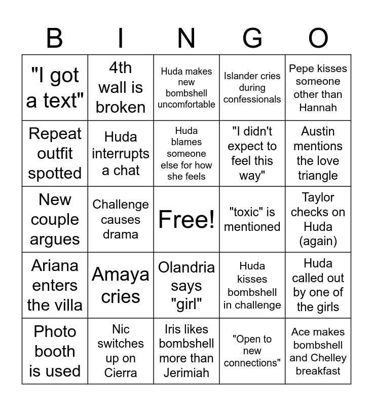 This bingo card has a free space and 24 words: Amaya cries, Nic switches up on Cierra, Huda blames someone else for how she feels, Photo booth is used, Pepe kisses someone other than Hannah, "I got a text", Repeat outfit spotted, 4th wall is broken, "toxic" is mentioned, Olandria says "girl", "I didn't expect to feel this way", New couple argues, Huda kisses bombshell in challenge, Huda called out by one of the girls, Huda interrupts a chat, "Open to new connections", Taylor checks on Huda (again), Huda makes new bombshell uncomfortable, Austin mentions the love triangle, Challenge causes drama, Ace makes bombshell and Chelley breakfast, Ariana enters the villa, Islander cries during confessionals and Iris likes bombshell more than Jerimiah.