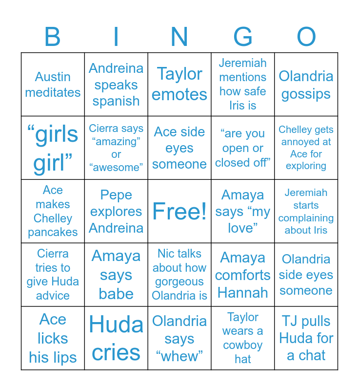 This bingo card has a free space and 29 words: Ace licks his lips, Huda explores the bombshell, Pepe explores Andreina, Hannah gets jealous about Pepe, Austin meditates, Taylor emotes, Cierra says “amazing” or “awesome”, Amaya says babe, Amaya says “my love”, Huda cries, Jeremiah starts complaining about Iris, TJ pulls Huda for a chat, Olandria says “whew”, Taylor wears a cowboy hat, Chelley gets annoyed at Ace for exploring, Narrator uses British slag, Nic talks about how gorgeous Olandria is, Cierra tries to give Huda advice, Olandria gossips, Ace makes Chelley pancakes, Amaya comforts Hannah, “take your man”, “are you open or closed off”, “girls girl”, Jeremiah mentions how safe Iris is, Andreina speaks spanish, Olandria side eyes someone, Ace side eyes someone and Ace plans a date for chelley in the villa.