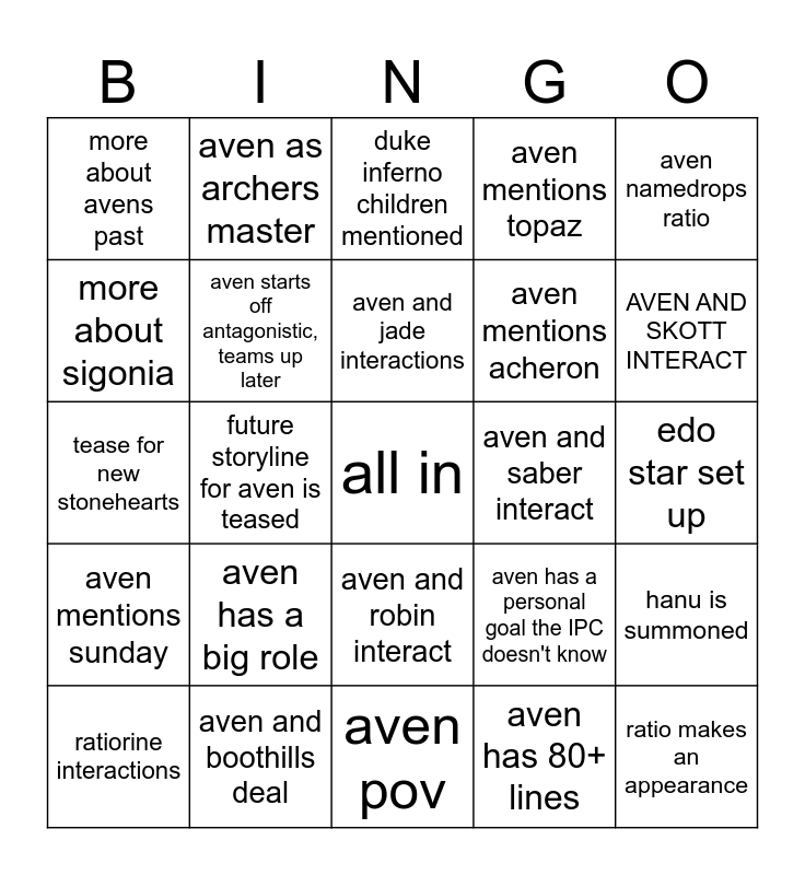 This bingo card has a free space and 24 words: aven has a big role, aven and boothills deal, aven and jade interactions, ratiorine interactions, aven namedrops ratio, more about avens past, more about sigonia, aven as archers master, aven and saber interact, aven and robin interact, aven mentions acheron, tease for new stonehearts, aven has a personal goal the IPC doesn't know, hanu is summoned, aven starts off antagonistic, teams up later, aven has 80+ lines, edo star set up, duke inferno children mentioned, AVEN AND SKOTT INTERACT, future storyline for aven is teased, ratio makes an appearance, aven mentions sunday, aven mentions topaz and aven pov.