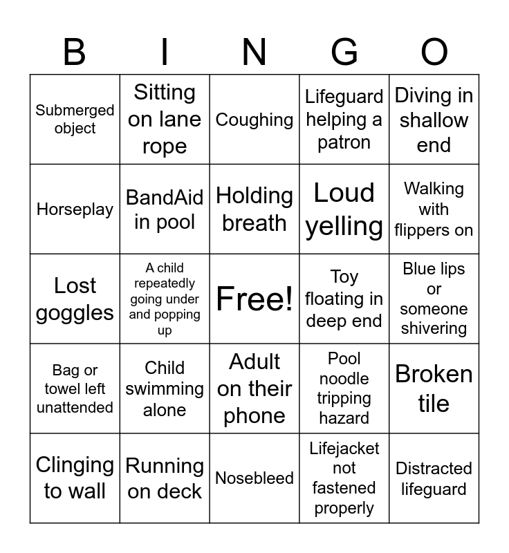 This bingo card has a free space and 24 words: Child swimming alone, Running on deck, Holding breath, Clinging to wall, Diving in shallow end, Submerged object, Horseplay, Sitting on lane rope, Toy floating in deep end, Adult on their phone, Loud yelling, Lost goggles, Pool noodle tripping hazard, Broken tile, BandAid in pool, Lifejacket not fastened properly, Blue lips or someone shivering, Coughing, Walking with flippers on, A child repeatedly going under and popping up, Distracted lifeguard, Bag or towel left unattended, Lifeguard helping a patron and Nosebleed.