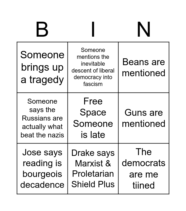 This bingo card has a free space and 8 words: Guns are mentioned, Beans are mentioned, Someone mentions the inevitable descent of liberal democracy into fascism, Jose says reading is bourgeois decadence, Someone brings up a tragedy, The democrats are me tiined, Someone says the Russians are actually what beat the nazis and Drake says Marxist & Proletarian Shield Plus.