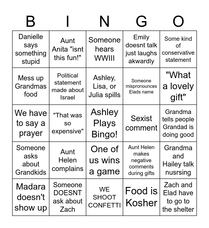 This bingo card has a free space and 24 words: Aunt Helen complains, Someone DOESNT ask about Zach, Ashley, Lisa, or Julia spills, Madara doesn't show up, Some kind of conservative statement, Danielle says something stupid, Mess up Grandmas food, Aunt Anita "isnt this fun!", Sexist comment, One of us wins a game, Someone mispronounces Elads name, We have to say a prayer, Aunt Helen makes negative comments during gifts, Grandma and Hailey talk nusrsing, Political statement made about Israel, Food is Kosher, Grandma tells people Grandad is doing good, Someone hears WWIII, "What a lovely gift", "That was so expensive", Zach and Elad have to go to the shelter, Someone asks about Grandkids, Emily doesnt talk just laughs akwardly and WE SHOOT CONFETTI.